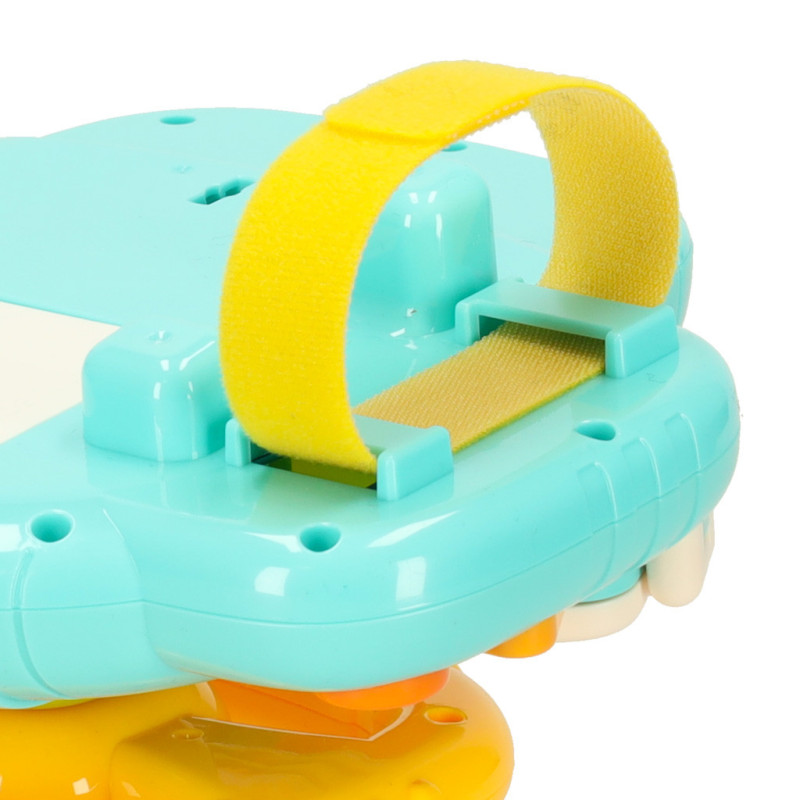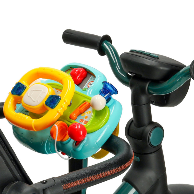 Hlasitosť efektov je možné nastaviť na dve úrovne. Vďaka priloženému popruhu sa dá volant jednoducho pripevniť na kočík, takže dieťa sa môže hrať aj počas prechádzky.