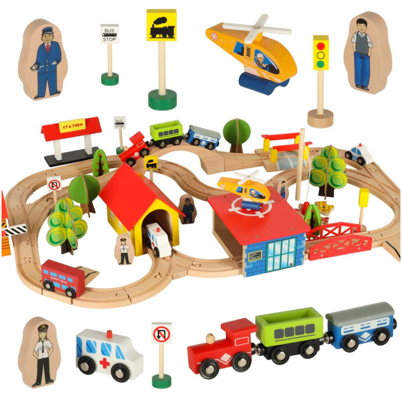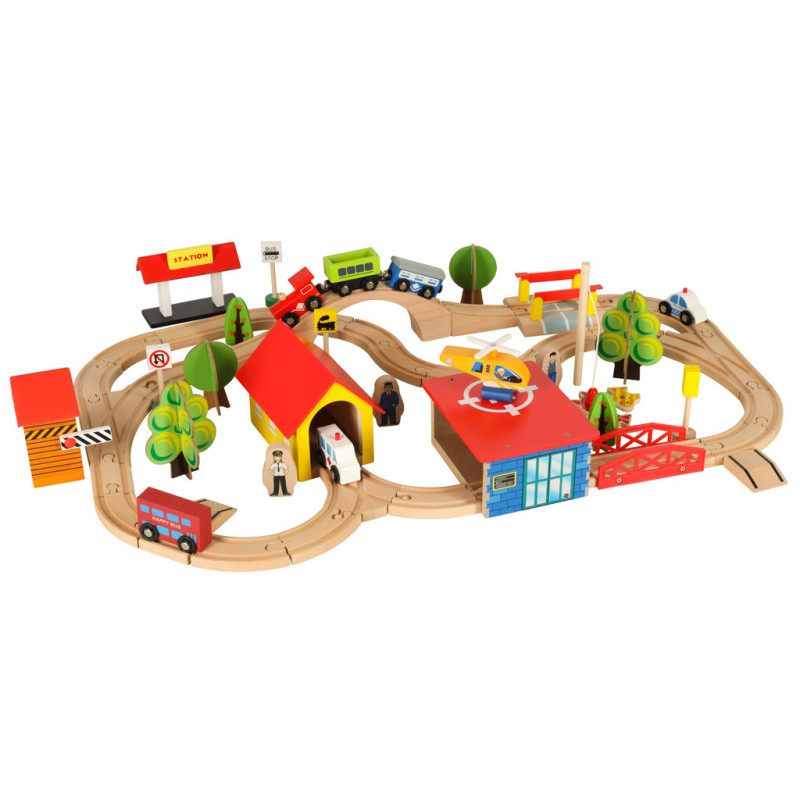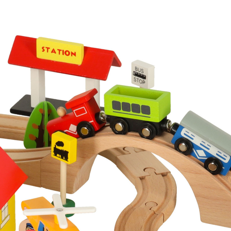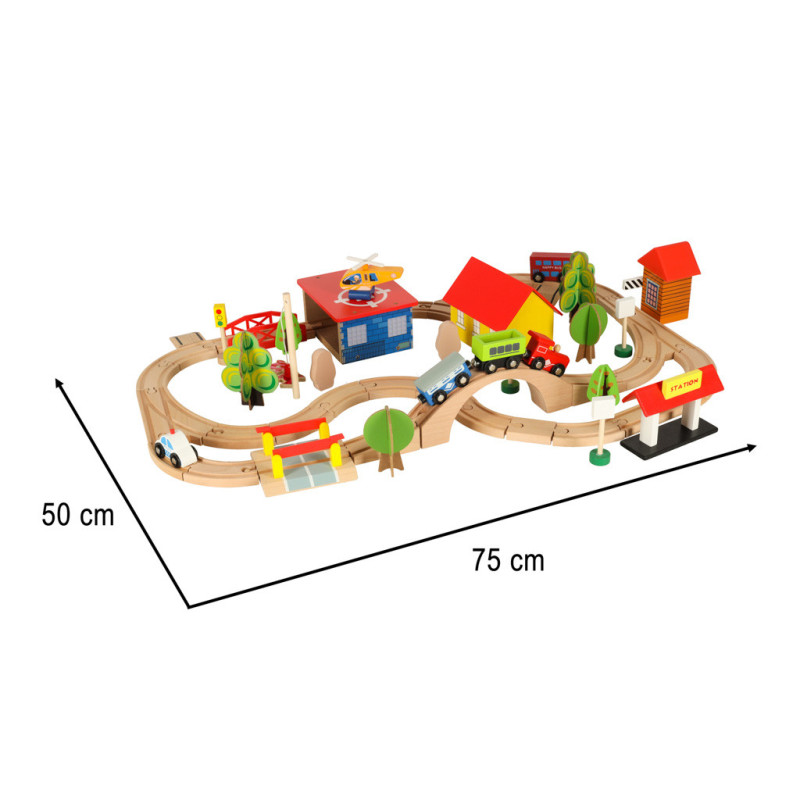 Dřevěná vlaková souprava Město – 69 dílů je perfektní hračkou, která spojuje zábavu a učení.
