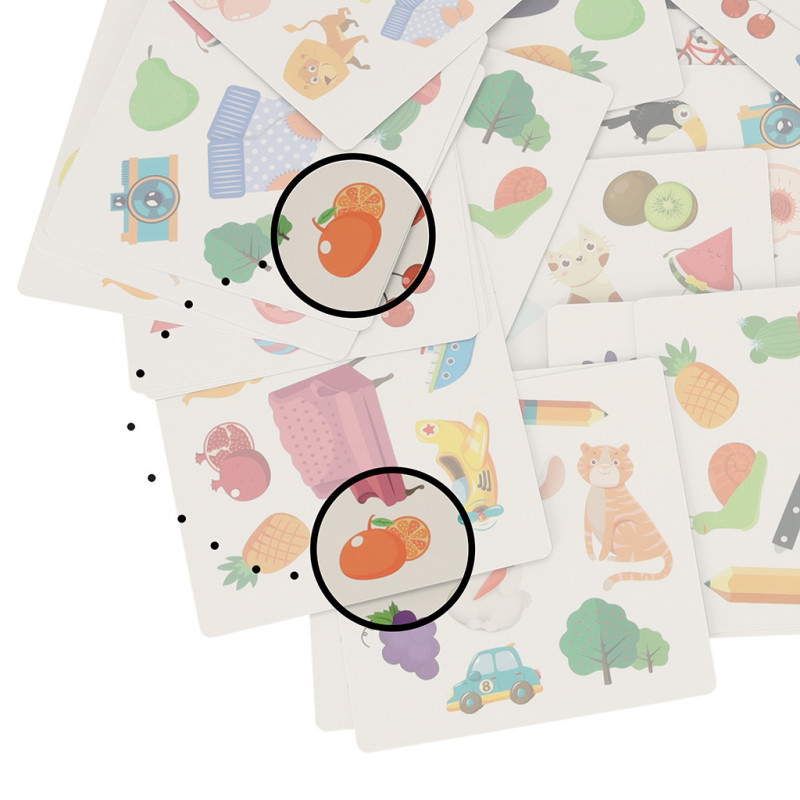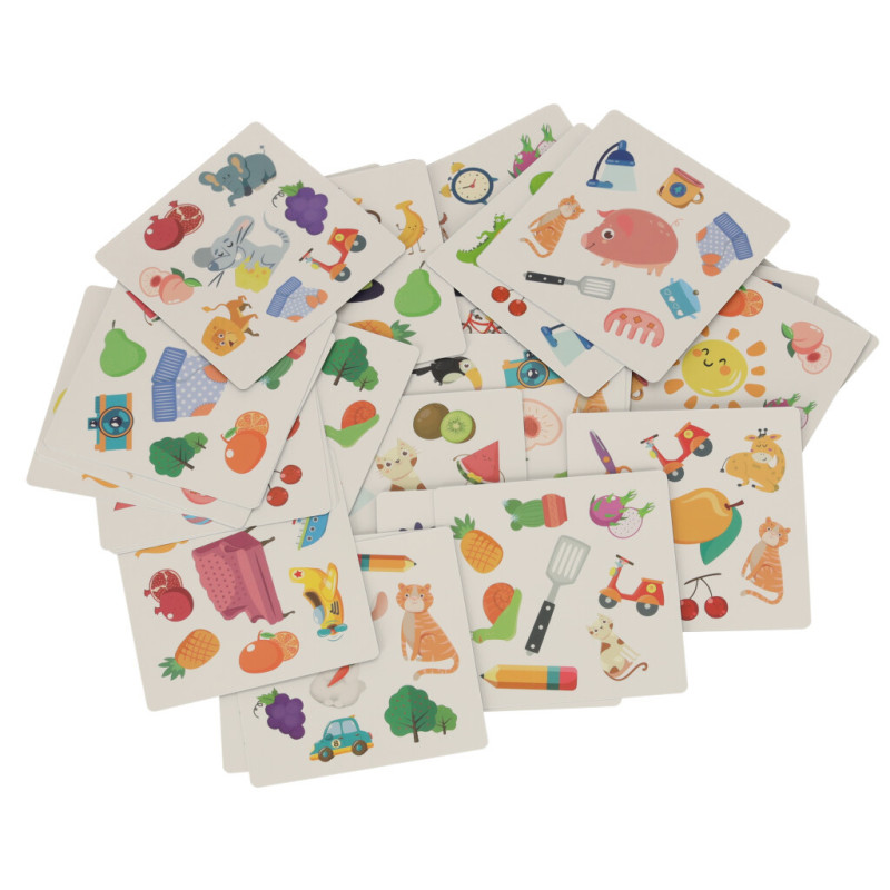Hlavním cílem je najít společný obrázek mezi dvěma kartami. Ačkoli je v sadě 54 karet s různými barevnými motivy, každé dvě karty mají pouze jeden společný prvek. Kdo ho najde jako první? Ten získává bod!