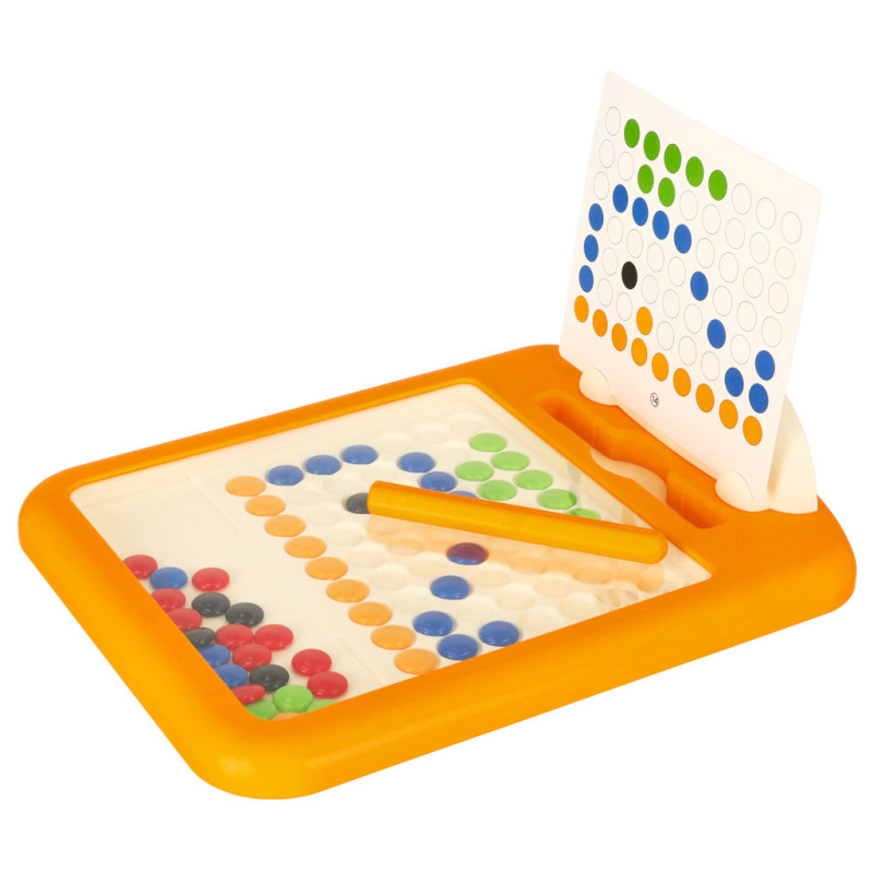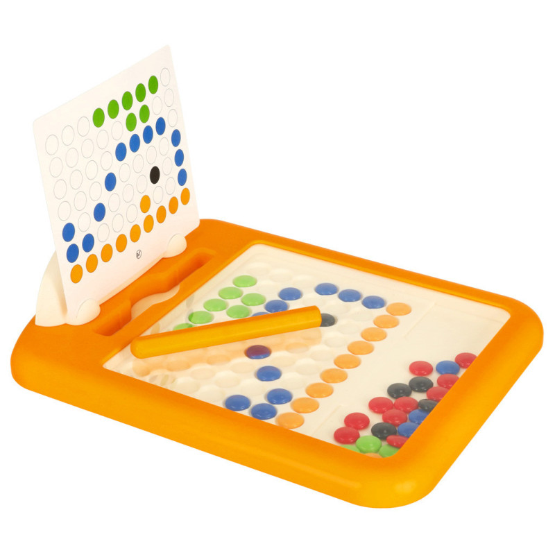 Magnetická tabule má barevné knoflíky, které lze přesouvat pomocí magnetického pera a vytvářet tak různé mozaiky, vzory a obrázky. Děti se mohou řídit dostupnými příklady nebo vymýšlet vlastní nové výtvory. Na tabuli je králíček, který batole provází během hry.
