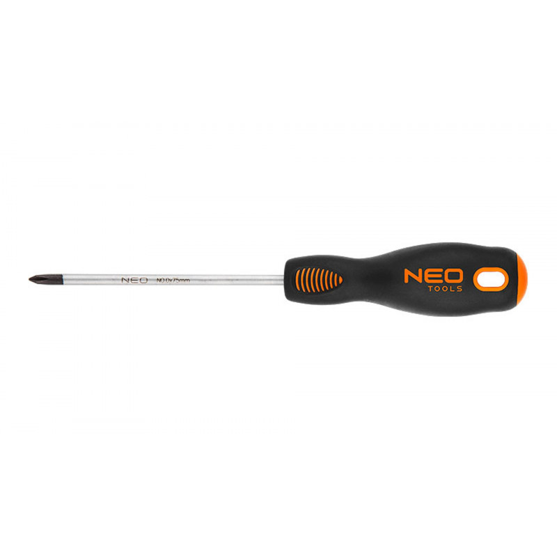 NEO Šroubovák, křížový. Dřík šroubováku je vyroben z mimořádně odolného S2. Čepel šroubováku je tepelně zpracována, aby se získala vhodná odolnost vůči ohybu a tvrdost 56 HRC. Šroubovák má magnetický hrot. Tvar tříramenné rukojeti s profilovanou opěrkou na palec snižuje námahu při práci a usnadňuje získání správného točivého momentu. Rukojeť vyrobena ze dvou materiálů, protiskluzová, odolná vůči chemikáliím, olejům a tukům. Kvalita nástroje potvrzená certifikátem TÜV a zárukou výrobce na 25 let. Značka NEO splňuje očekávání profesionálů.