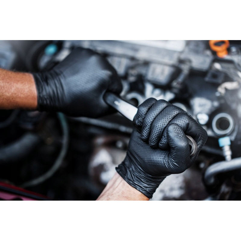Nitrilové rukavice GoGrip černé velikosti M, 50 ks jsou profesionální jednorázové rukavice vyrobené z odolného nitrilu, ideální pro náročné pracovní podmínky. Vyznačují se trojnásobnou tloušťkou oproti standardním rukavicím, 3D diamantovou texturou pro vynikající úchop a jsou vhodné pro práci v mastném a vlhkém prostředí. Tyto rukavice neobsahují latex, jsou bez pudru a splňují normy EN ISO 374-1, EN ISO 374-2, EN ISO 374-4, EN ISO 374-5, EN ISO 16523-1 a EN ISO 21420, což zaručuje vysokou ochranu proti chemikáliím a mikroorganismům.