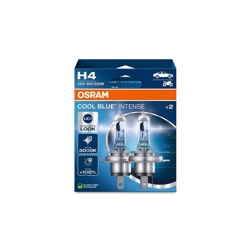 Žárovka Osram Cool Blue Intense dokáže skvěle imitovat xenonová světla díky vysoké svítivosti a jasnému bílo-namodralému světlu. Toto světlo vypadá svou modřením stylově a zároveň se podobá z pohledu řidiče dennímu světlu, a vám tak při jízdě ve tmě nic neunikne. Jedná se o „nejmodřejší“ halogenové žárovky, které lze legálně namontovat. V porovnání se standardními halogenovými žárovkami mají o 20% vyšší intenzitu světla . Můžete si tak dovolit luxus mnohem dražších xenonových světel i ve vašem autě.
