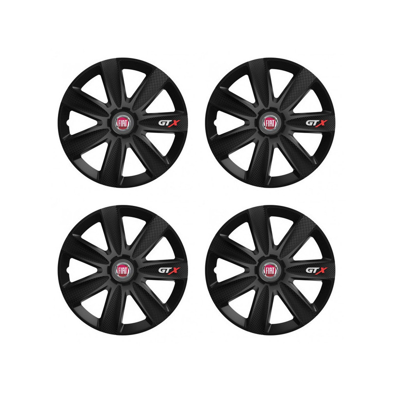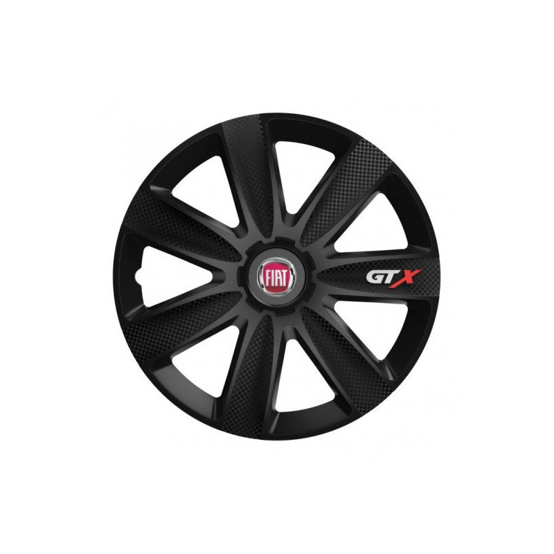 Poklice 14 GTX CARBON black pro Fiat (červené) na ocelové disky. Pro kola o velikosti R14 s pryskyřičnými samolepkami Fiat (červené).Příjemce :