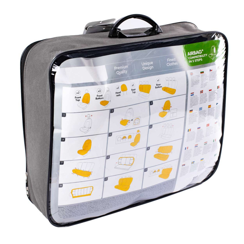 Univerzální použití: Potahy mají zapínání na zadním sedadle, díky čemuž pasují na většinu sedadel dostupných na trhu (nedělené pohovky). Potahy nemají výřezy pro pásy a zadní opěrky hlavy z důvodu jejich použití pro různé modely aut. Potřebné otvory si musíte udělat sami po precizním osazení a montáži.