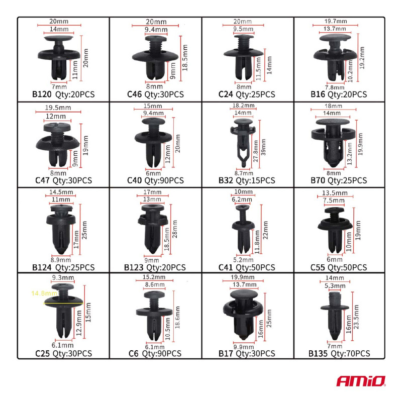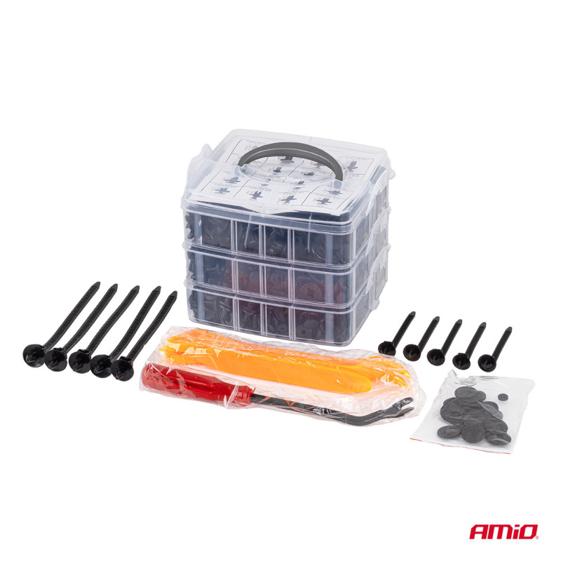 Sada univerzálních upevňovacích prvků, klipů, hmoždinek spolu s nástroji pro jejich demontáž – celkem 650 kusů. Vyrobeno z vysoce kvalitního PVC plastu, který zaručuje odolnost a dlouhou životnost.