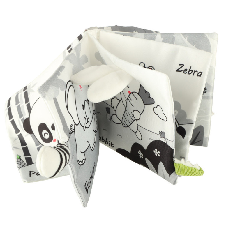 Knížka se skládá ze 4 stran s barevnými obrázky zvířátek včetně: sovy, opice, pandy, mývala, slona, králíčka, krokodýla a zebry.