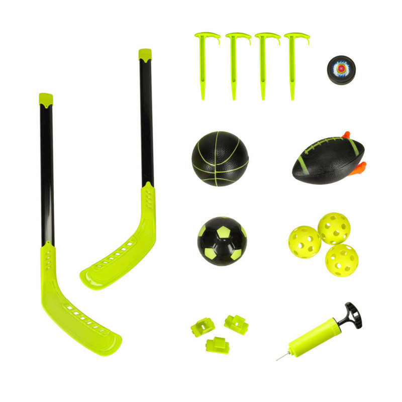 Vyberte si sportovní soupravu 6v1 - jeden základ, mnoho možností! Fotbal, basketbal, hokej, ragby, ale i trénink na terč - to vše nabízí naše sada. Nemusíte kupovat samostatné branky pro každý sport zvlášť - díky modulární konstrukci můžete fotbalovou branku jednou a dvakrát přeměnit na terč pro trénink přesnosti nebo basketbalový koš. Navíc se také nemusíte starat o nákup potřebného tréninkového vybavení. Veškeré potřebné příslušenství již máte v sadě: tři nafukovací míče (na fotbal, basketbal a ragby), plastové míče na trénink na terč, puk a hokejky, a dokonce i sítě, pumpu a plastové kolíky na ukotvení branky.