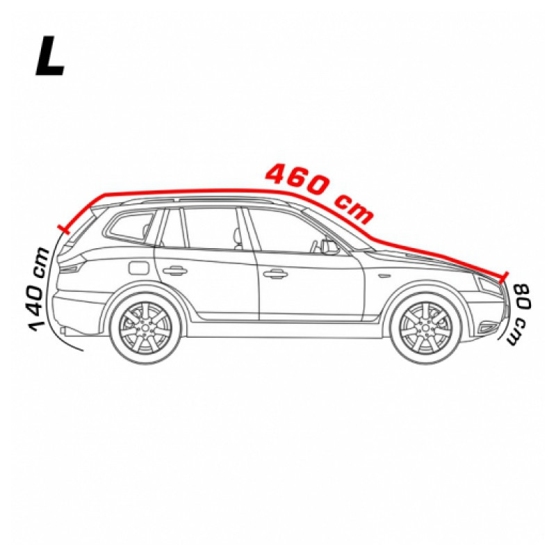 Vhodná pro SUV a vyšší auta s horní délkou auta do 460cm (přesněji nakreslená na obrázku). Je třeba změřit tuto délku. Pokud je délka větší, je třeba již zvolit delší plachtu (SUV XL)