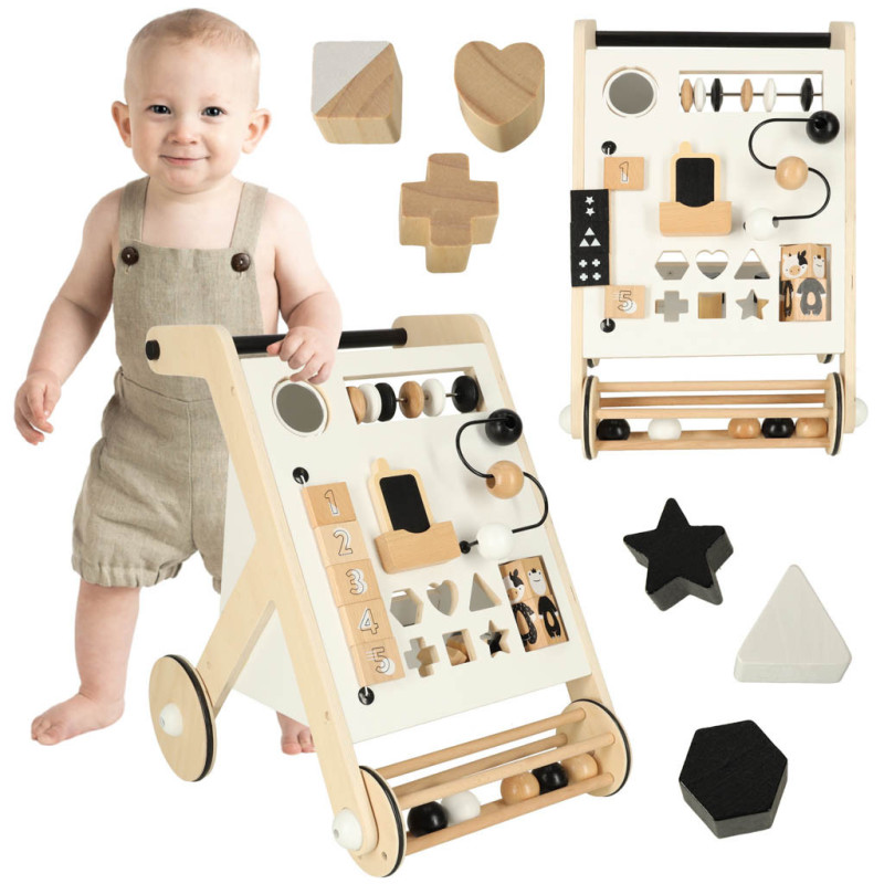 Vzdělávací dřevěné chodítko s třídičem je ideální pomůckou při učení prvních krůčků, která zároveň podporuje rozvoj jemné motoriky a logického myšlení. Vašemu děťátku poskytne nejen oporu, ale i spoustu zábavy díky zabudovaným vzdělávacím prvkům.