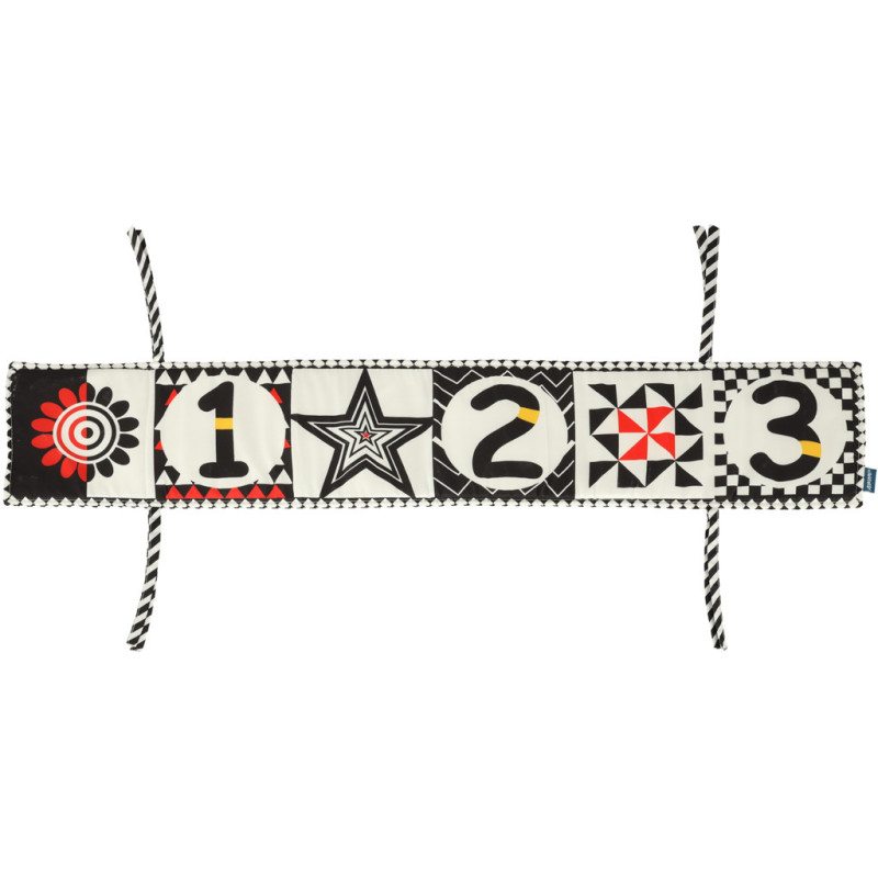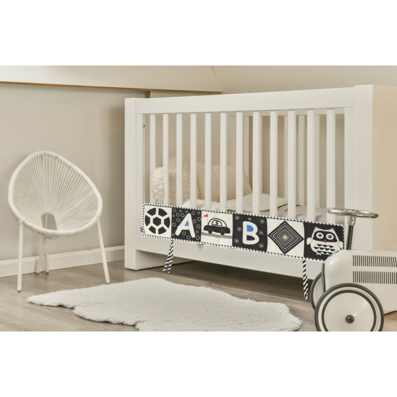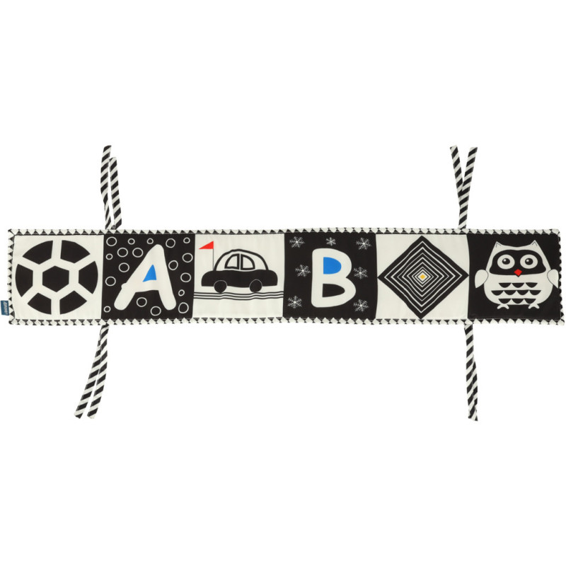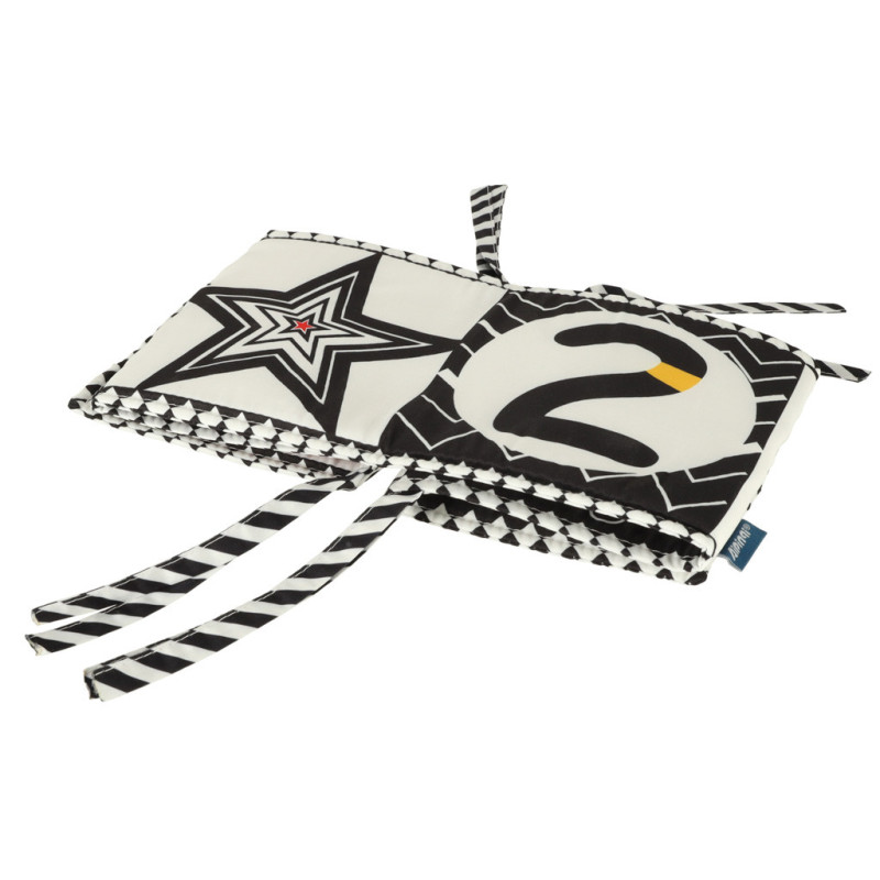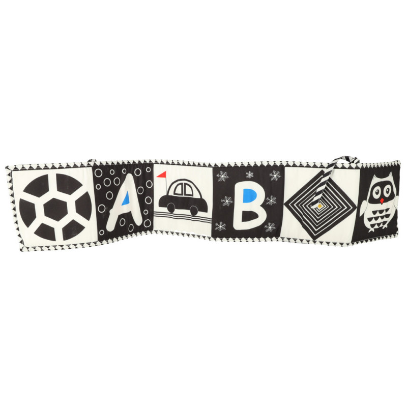Tato měkká látková knížka ve tvaru harmoniky je ideální jako první čítanka i jako ochranná podložka do postýlky. Pomocí provázků ji snadno připevníte k příčkám dětské postýlky. Obsahuje 12 různých kontrastních vzorů, které upoutají pozornost a stimulují zrakové vnímání miminka.