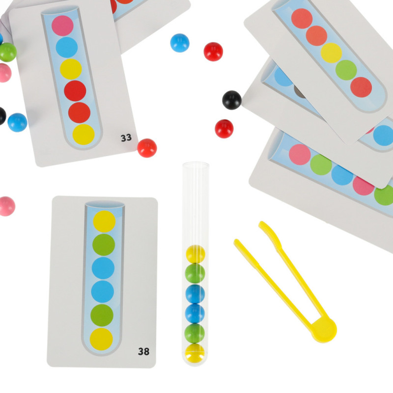 Hlavním úkolem dítěte je třídit barevné kuličky do zkumavky podle předloh nebo podle vlastní fantazie. Kuličky lze vkládat prsty nebo přiloženou pinzetou – což výrazně zlepšuje motoriku a přesnost pohybů.