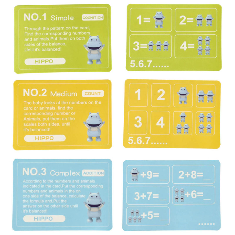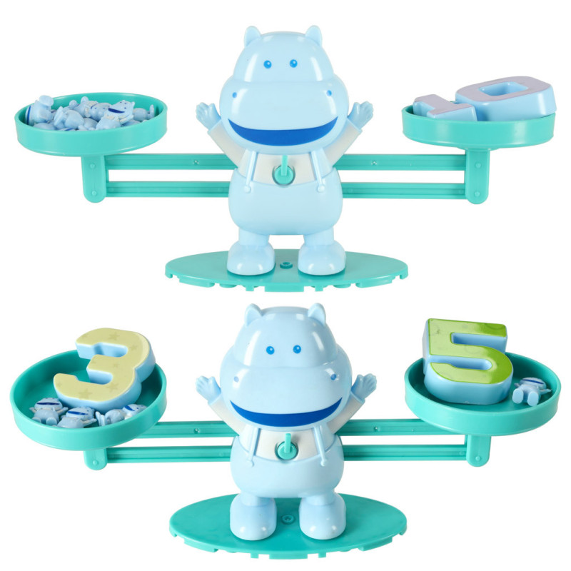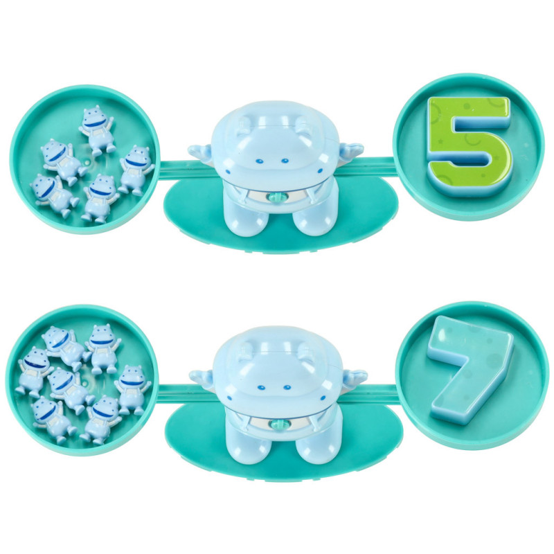 Každý malý hroch má stejnou váhu jako číslo 1. Dva hroši váží stejně jako číslo 2 atd. Děti mohou při hře porovnávat a zjišťovat, kolik hrochů je potřeba k vyvážení konkrétního čísla. Pomocí váhy a pestrých dílků se přirozeně učí základy matematiky.